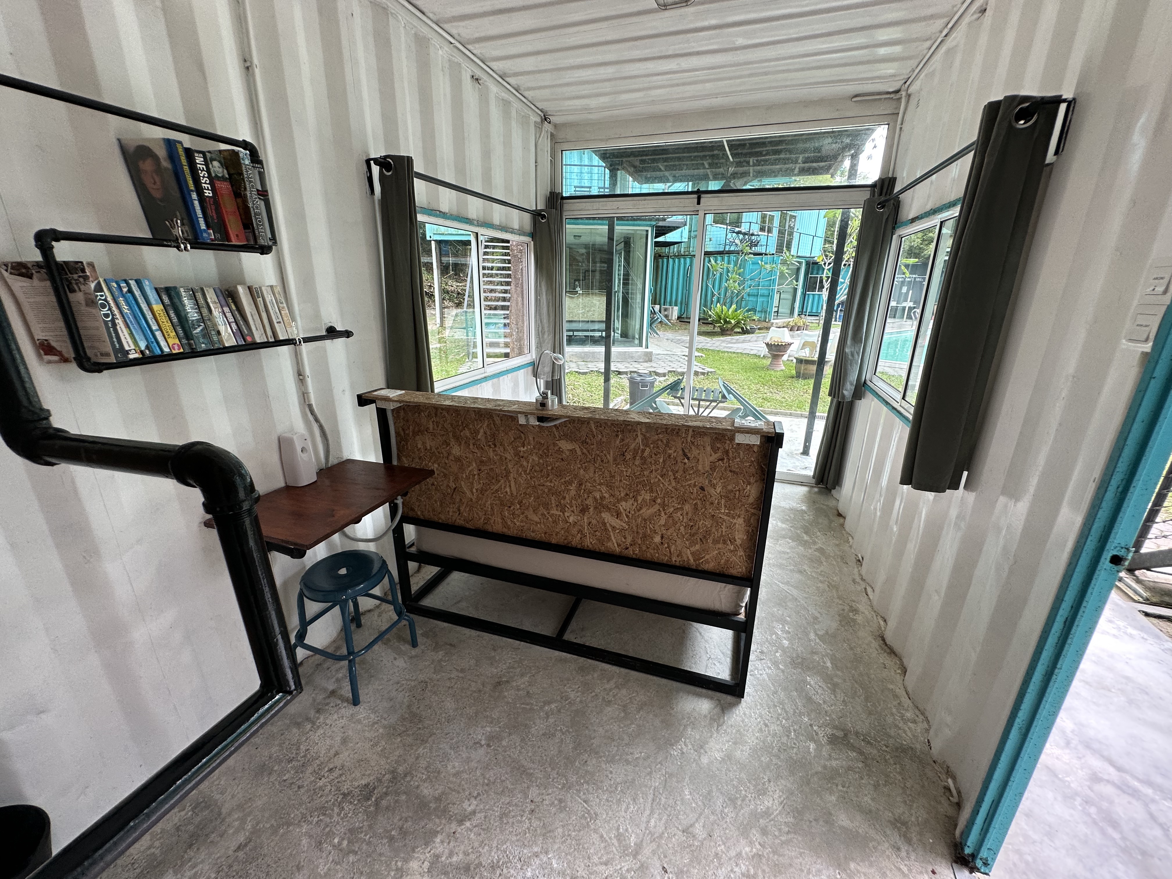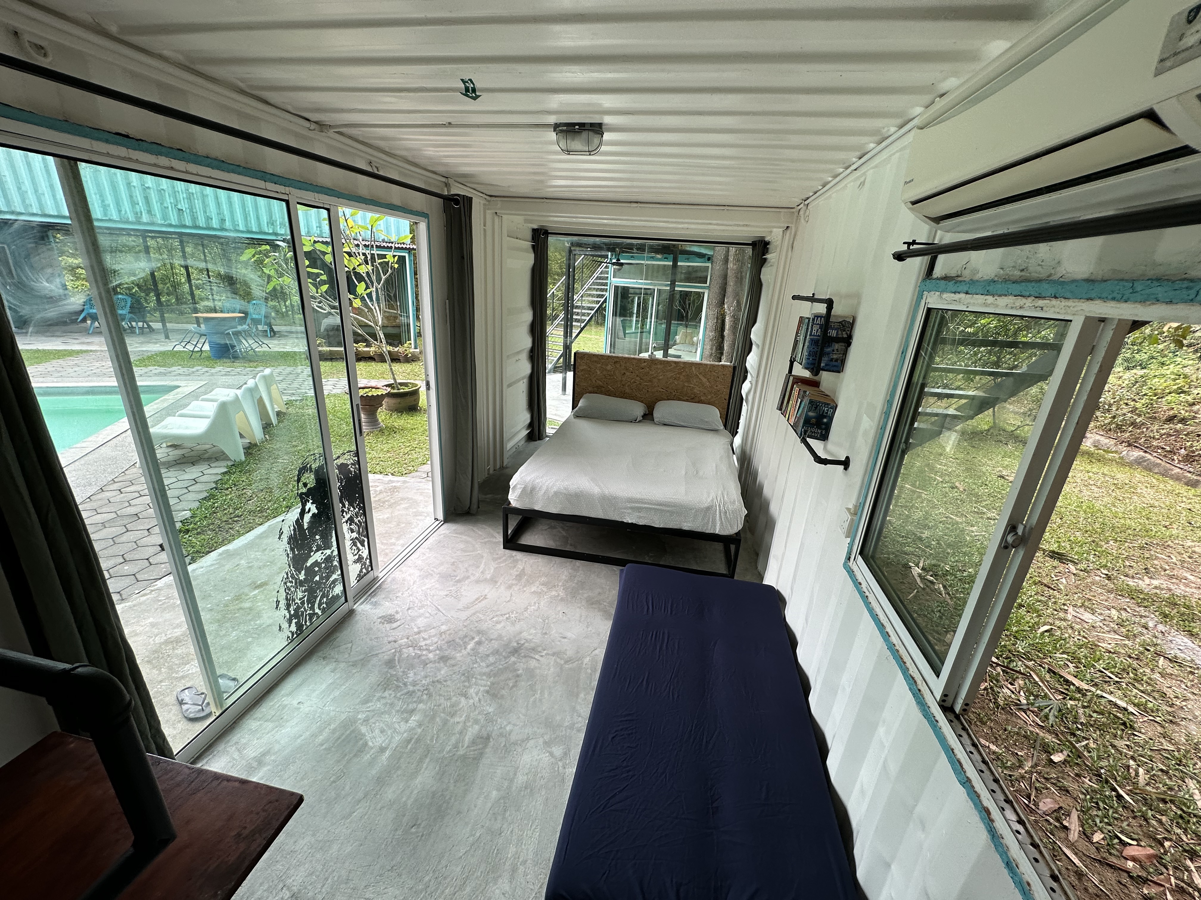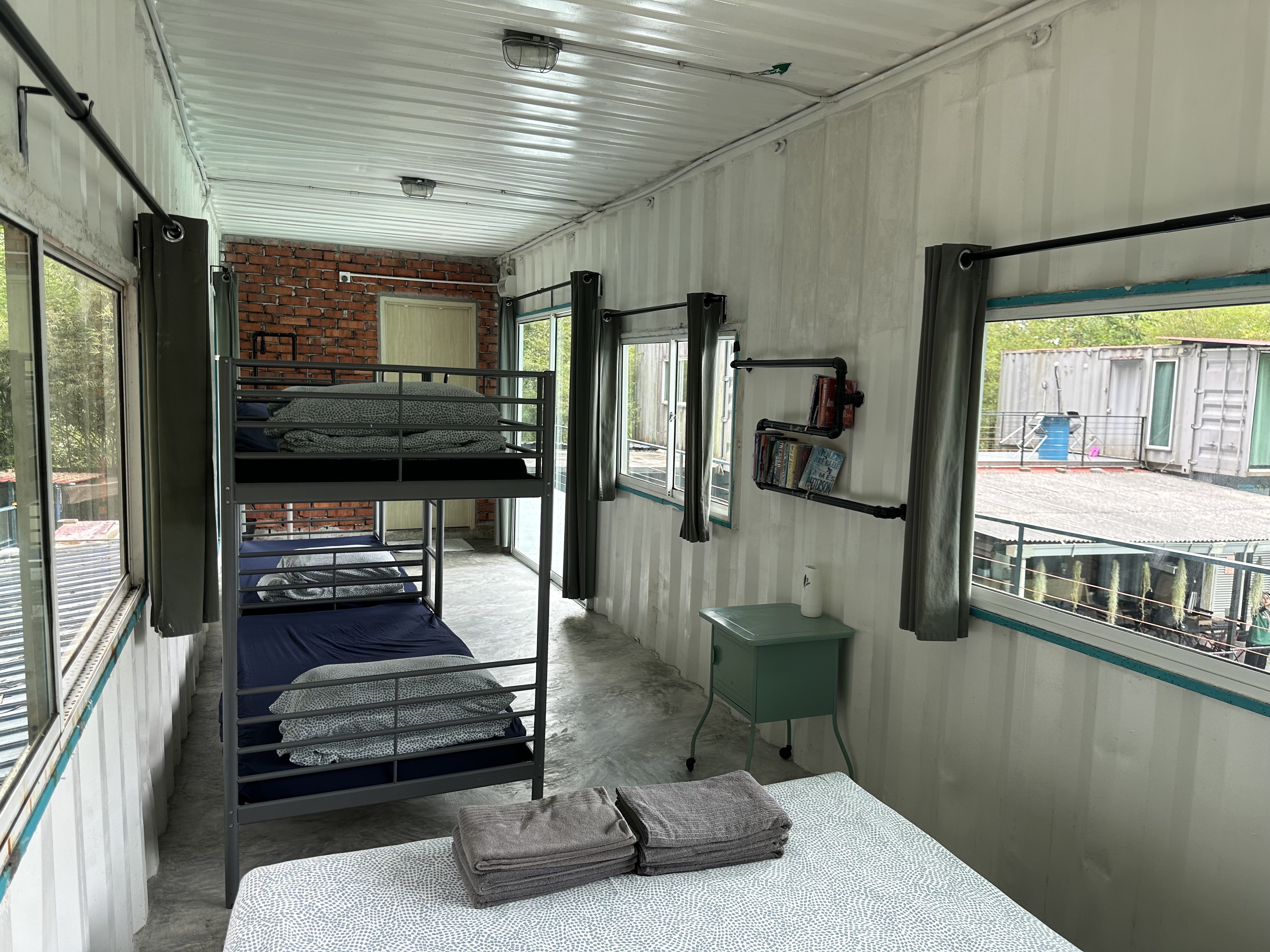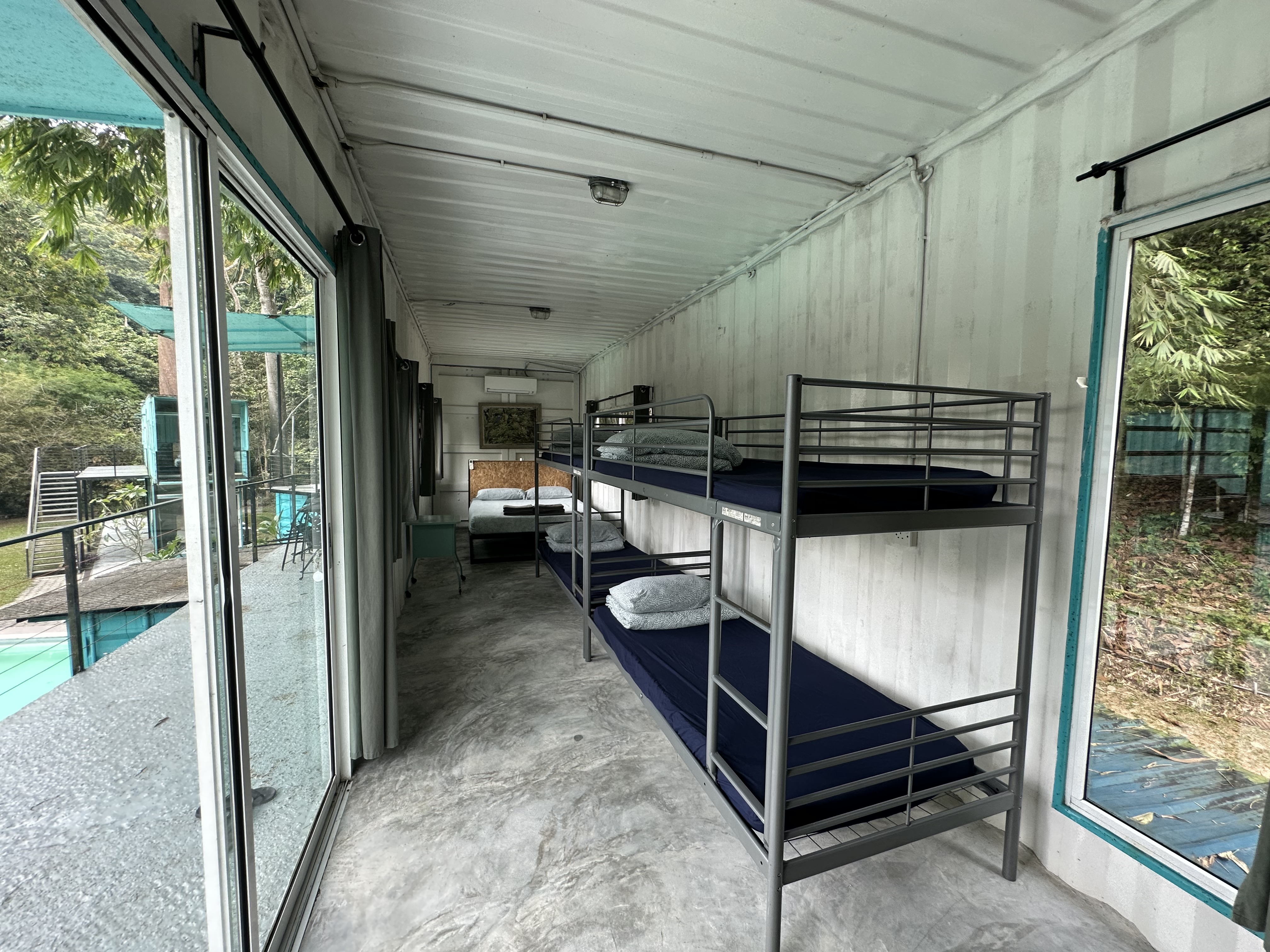The Large Room is situated on the 1st floor with a large balcony area facing the swimming pool. Made from a 40 feet shipping container, it measures 320 square feet and comes with a spacious en suite bathroom. The room comes with a queen bed and two double-deck single bunk beds which fits a total of 6 persons. It is fully air conditioned and with its industrial design furnishing, makes for a comfortable adventurous stay.