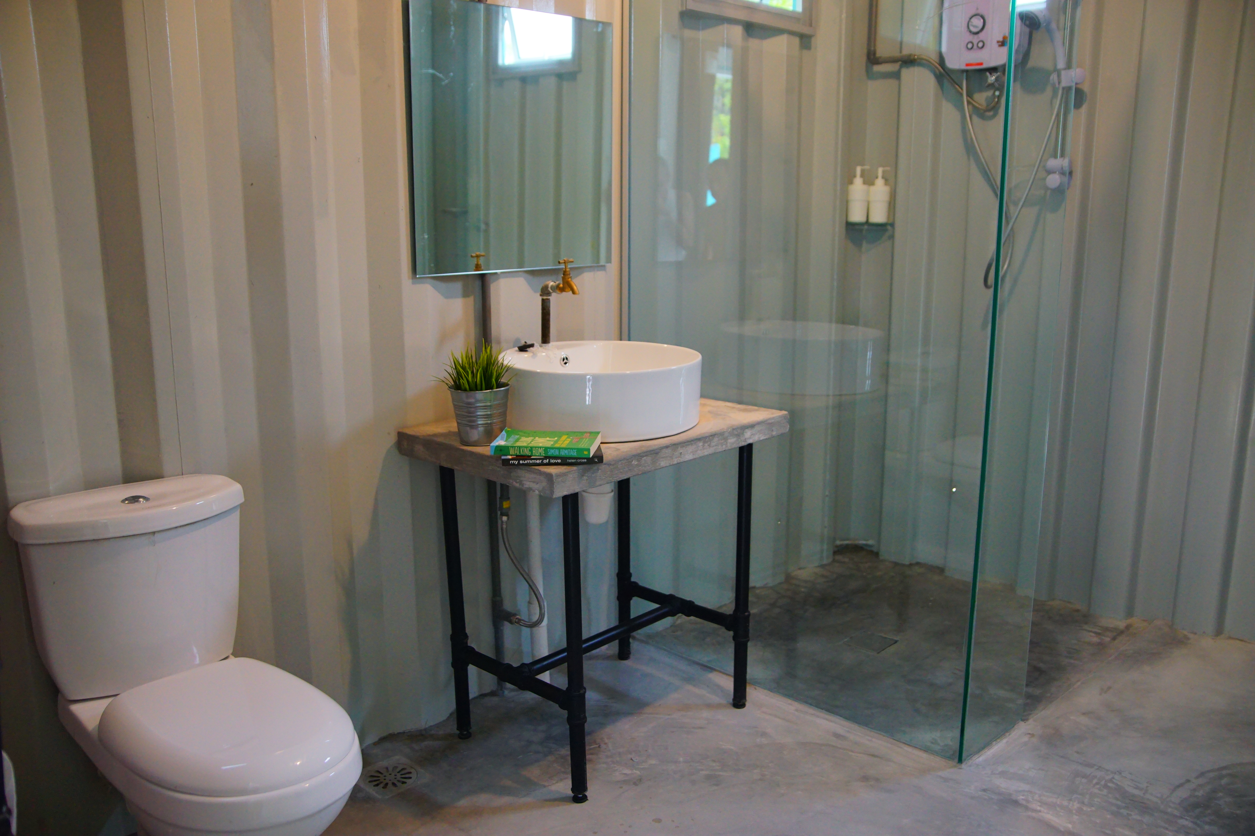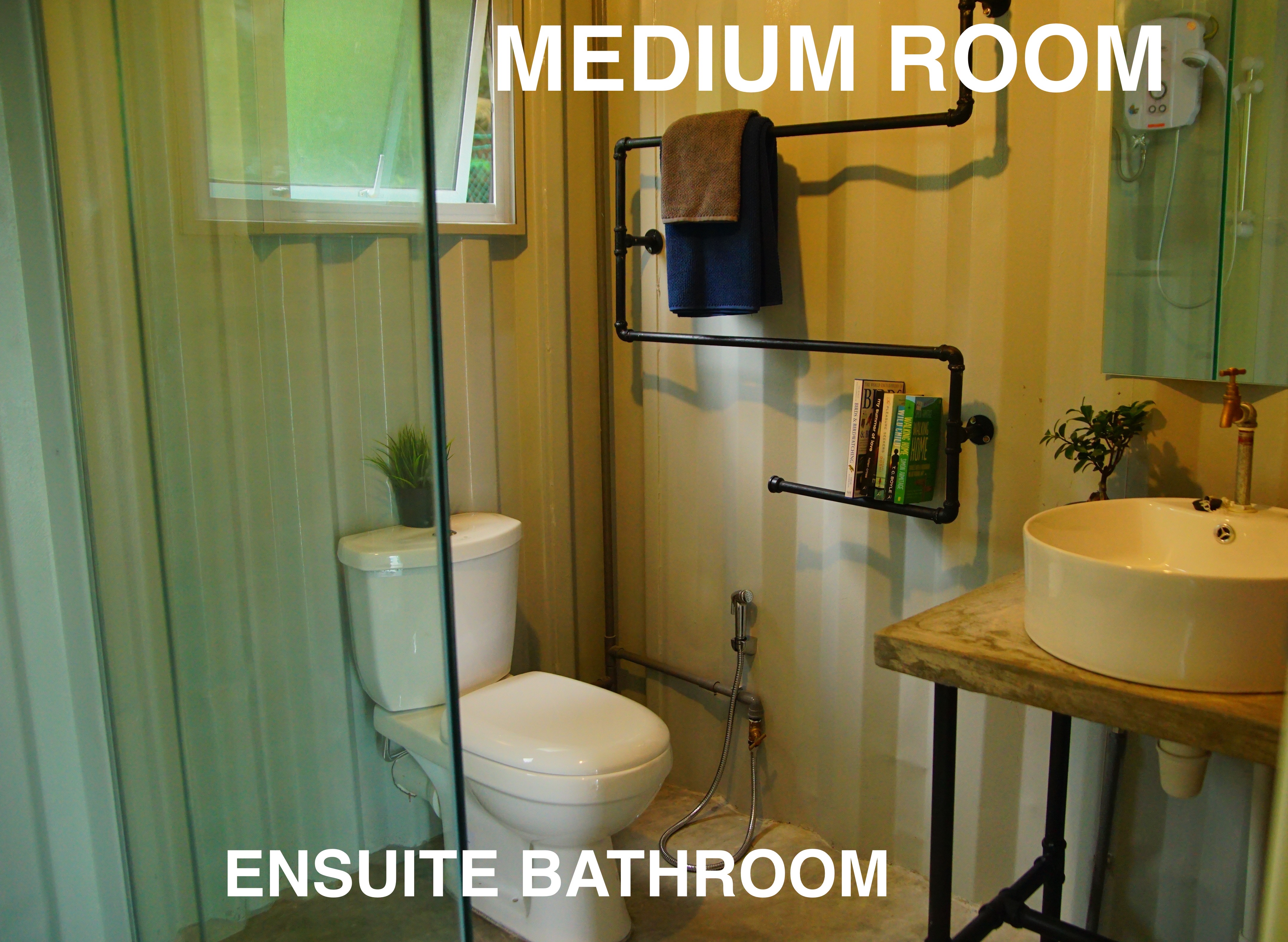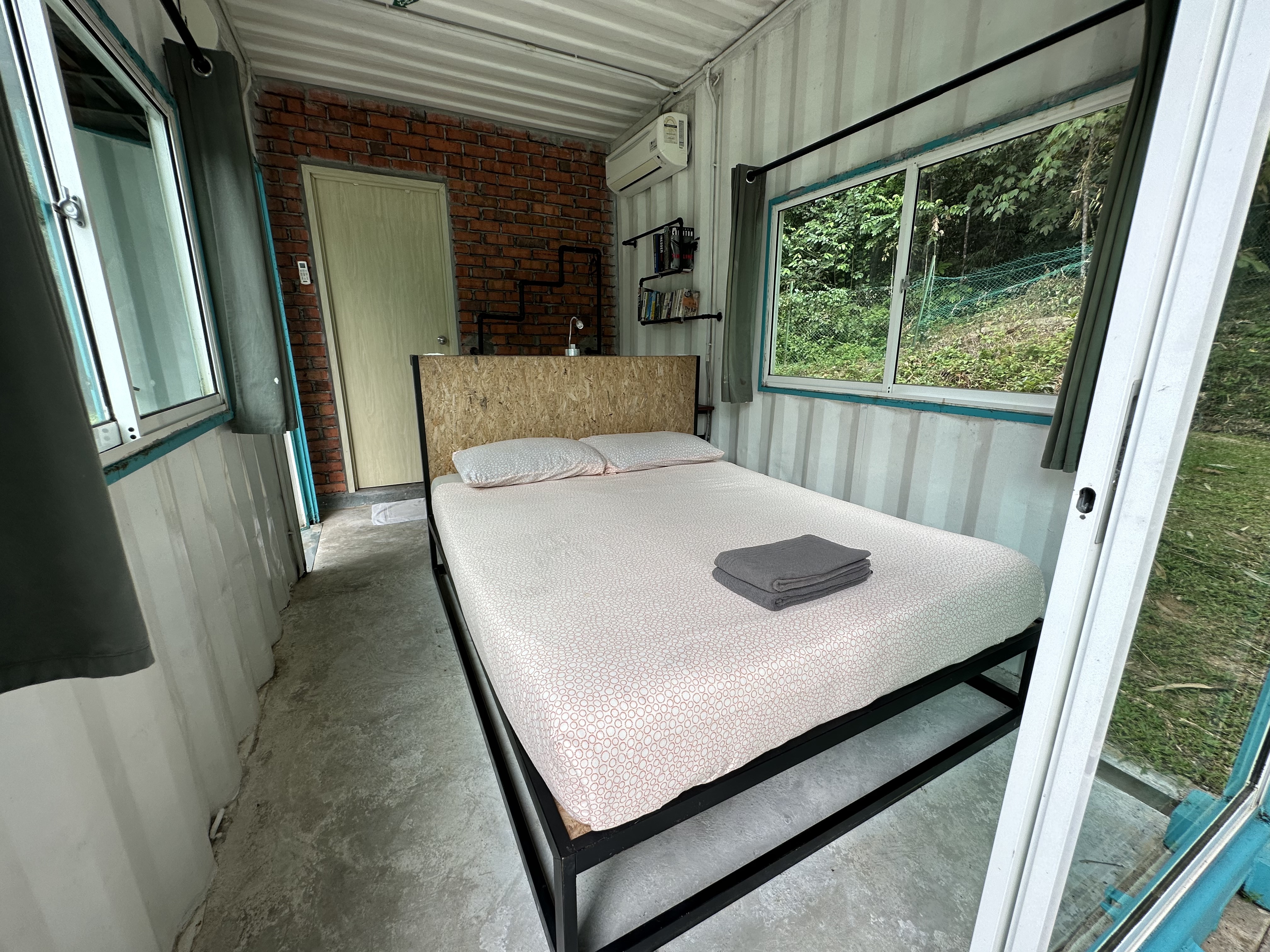There are 7 Medium Room situated on the property. All Medium Rooms encircle and faces the swimming pool. Made from a 20 feet shipping container, it measures 192 square feet and comes with an en suite bathroom. The room comes with a queen bed and a sofa single bed to fit 3 persons. It is fully air conditioned and with its industrial design elements, makes for a comfortable stay whilst you enjoy its natural surroundings. All Medium Rooms comes with a private balcony or patio space.